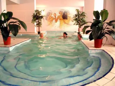 Предлага закрит и открит плувен басейн и голяма тераса за слънчеви бани с шезлонги.