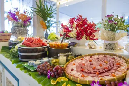 Гостите могат да опитат Индийска, Тайландска, Италианска, Европейска и местна кухня в три ресторанта на територията на комплекса. Менюто е шведска маса и ала карт.