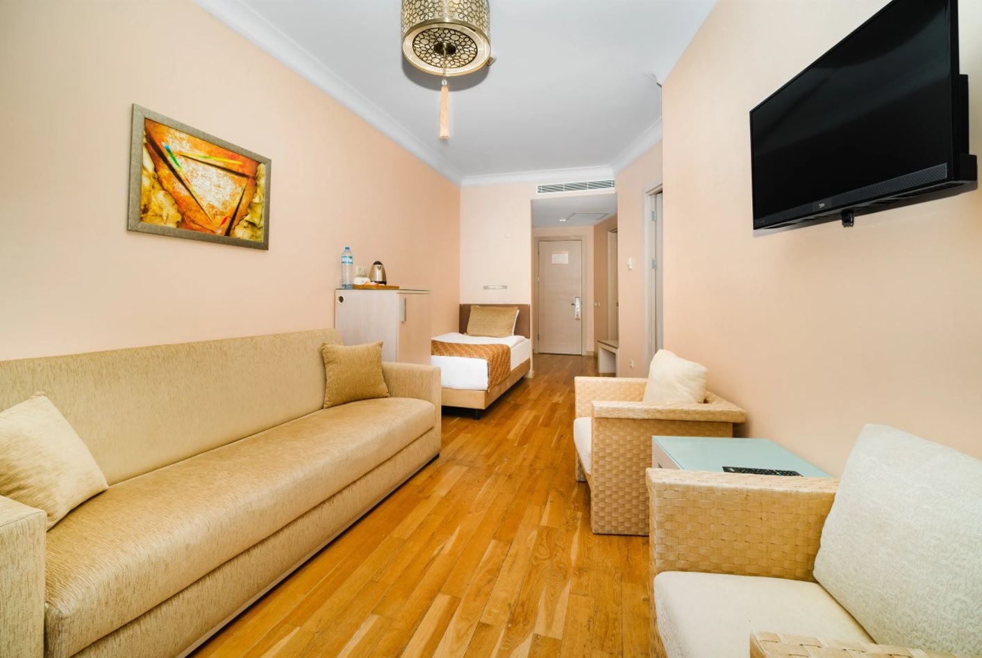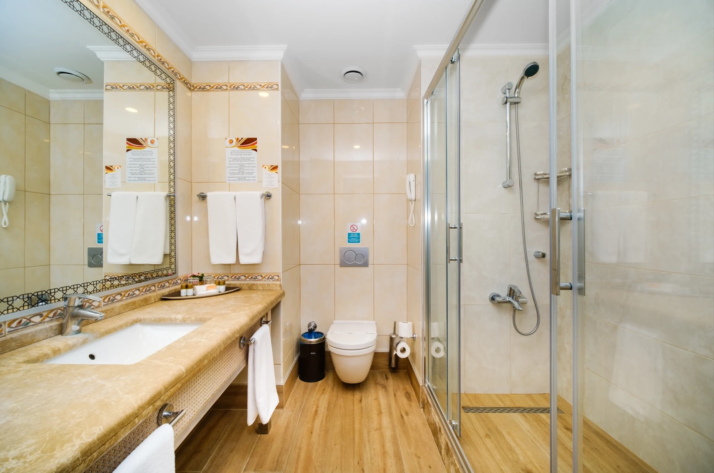 Всички стаи са оборудвани с климатик, телевизор, телефон, баня с душ/вана, сешоар, сет за чай/кафе, минибар (зарежда се с беалкохолни напитки - безплатно), сейф (безплатен).
