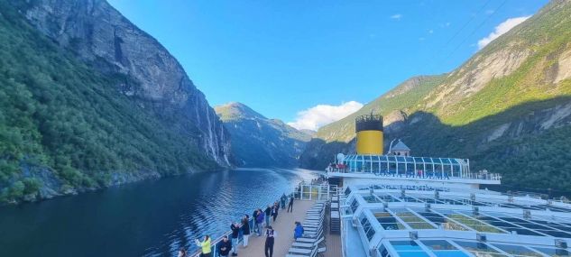 Между 10.00 и 11.00 ч. корабът ще плава през един от най-красивите фиорди в Норвегия – Гейрангер. По околните стръмни склонове, издигащи се над километър над водата ще видим водопада Седемте сестри. Срещу игривите води на седемте потока се намира друг водопад, наречен закачливо Ухажорът. Гейрангер е включен в листата на ЮНЕСКО. Престой в Гейрангер от 11.30 до 18.30 ч. Тук може да изберете между различните предложения на кораба: обиколка с каяк из фиорда, панорамна екскурзия с автобус, екскурзия с хеликоптер или велосипед.