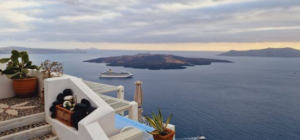 Най-мечтаният гръцки остров е пред нас. Разполагаме с цял ден, за да направим най-красивите снимки в албума си. Разходете се сами или елате с нас на екскурзия до 2 от най-знаковите места на острова. Ще разгледаме Ия, типично гръцко селище с тесни улички, традиционни къщи и прочутите бели църкви със сини куполи, станали визитна картичка на острова. Селцето се намира високо на хълма и от него се открива зрелищна картина към залива на Санторини. Ще посетим и столицата Фира, разположена върху калдерата на вулкана. Градът е с много оживени и живописни улички, обградени от синьо-бели къщи, магазини и заведения. От тук тръгва и въженият лифт, с който ще се спуснем до пристанището на Фира, за да се приберем на кораба /слизането на острова е с лодки от кораба.