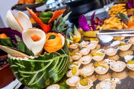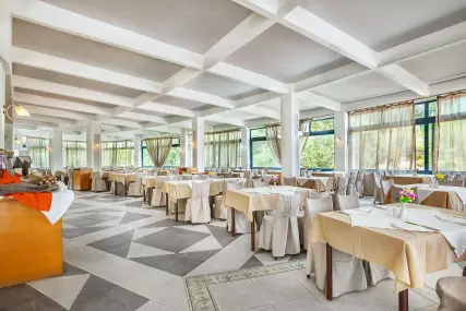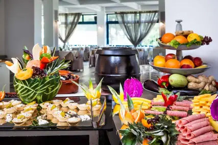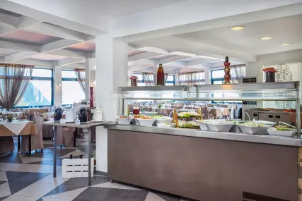 As for dinner you can choose, among the rich and various buffets, the dishes of your preference of the Greek and International cuisine. You can also enjoy the thematic nights that are organized every week (Italian night, fish night, ancient flavours). The bar âAvraâ is situated next to the pool, it is open from the morning until late at night and serves drinks, refreshing cocktails, fresh juice and snacks. You can end your night by taking part in the activities organized by the hotelâs animation group or by just enjoying your drink by the lightened pool, under the stars...