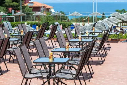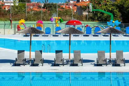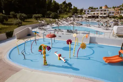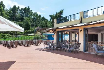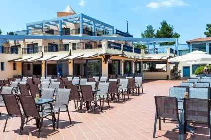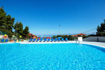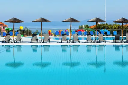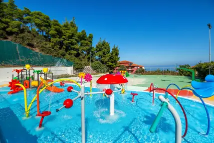 Enjoy the big veranda round our two freshwater pools, one for adults and one for children, with free deck-chairs and parasols. You can relax under their shade and take a dip in the poolsâ crystal clear waters at his halkidiki hotel. The restaurant âATHOSâ serves American buffet breakfast.