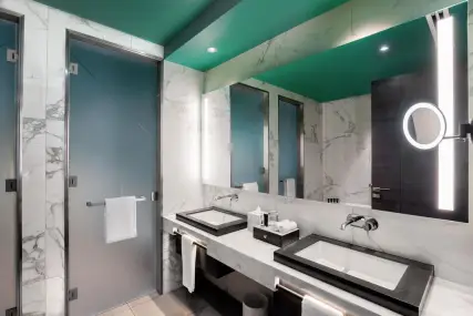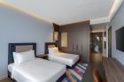 - Twin room: 36 кв.м, спалня, 2 единични легла (120 см х 200 см), баня, вана, душ, без балкон, изглед към града.