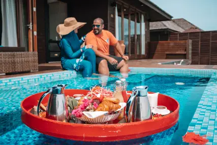 - 4 Sunset Water Suite (~182 кв.м) - водни вили с изглед към залеза и хидромасажен басейн (~14 кв.м). Състоят се от хол, спалня с голямо легло и кът за сядане, баня с хидромасажна вана и душ, тераса с хидромасажен басейн, шезлонги, кът за хранене и достъп до водата. Максималното настаняване е 3-ма възрастни или 2-ма възрастни и 2 деца.