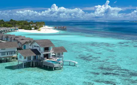 - 1 Two Bedroom Lagoon Pool Villa with Slide (251 кв.м) - двуетажна водна вила с басейн, водна пързалка и изглед към залеза. На партерен етаж: дневна с трапезария, тоалетна, спалня с двойно легло king size, спални с 2 отделни легла, 2 бани с отделни бани и душове, тераса с басейн, шезлонги, водна пързалка, зона за отдих и спускане във водата. На втория етаж: дневна с трапезария и балкон. Максимално настаняване - 4 възрастни и 2 деца или 3 възрастни и 3 деца или 2 възрастни и 4 деца.