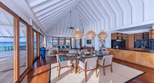 - 10 One-Bedroom Family Over Water Pool Villa (~259 кв.м) - водни вили с басейн. Състои се от спалня с двойно легло с кралски размери, малка спалня с отделни легла, съблекалня, просторна баня с хидромасажна вана и покрити и открити душове, тераси с басейн, шезлонги, люлка, кът за хранене и освобождаване във водата Максимално настаняване - 3 възрастни и 2 възрастни или 3 деца.