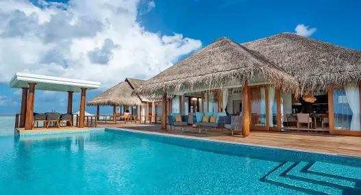- 2 Two Bedroom Sunset Over Water Pool Residence (~1861 кв.м) - водни вили с басейн и изглед към залеза. Състои се от просторна дневна с трапезария, двойно легло с кралски размери и две съблекални, спални с отделни легла и две съблекални, две бани с хидромасажна вана и душ, тераса с басейн, шезлонги, люлка, кът за хранене и спускане във водата. Максимално настаняване - 6 възрастни и 2 деца или 4 възрастни и 4 деца.