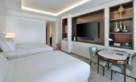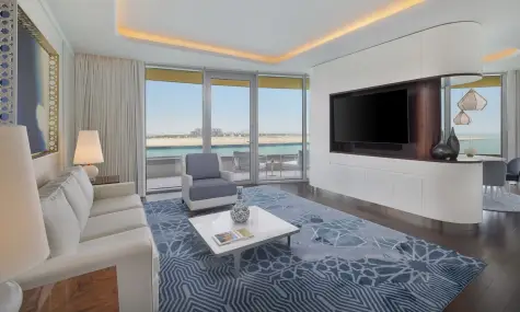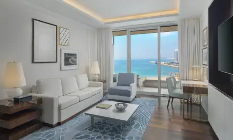 One-bedroom corner suite with sea view: 201 кв. m, спалня, Кинг-размер легло, хол, трапезария, 2 бани, душ и вана, балкон (50 кв. m), гледка към морето.