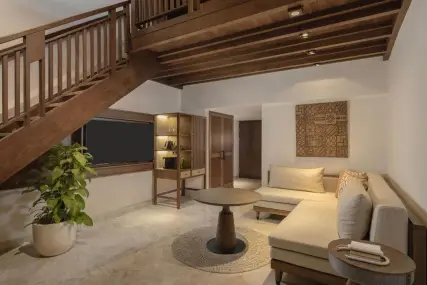 - Suite: 60 m2, 1, 2, 3 и 4 сгради, двуетажна стая, 4 етаж, спалня, двойно легло, хол 1 етаж, баня с душ, балкон, изглед към градината..