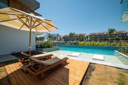 Lake House Swim-Up Suite (78 кв. м) – Стилен и модерен дизайн, директен достъп до басейна и шезлонги и чадъри за почивка.