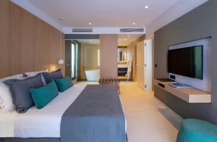 Хотелът се състои от 258 стаи и апартаменти, всички декорирани в ярки деликатни цветове, характерни за традиционната островна култура.Стаите и апартаментите в Skiathos Palace са климатизирани и обзаведени с вкус. Всяка е оборудвана със сателитна телевизия, минибар и безплатни тоалетни принадлежности. Всички помещения имат излаз на обзаведен балкон.