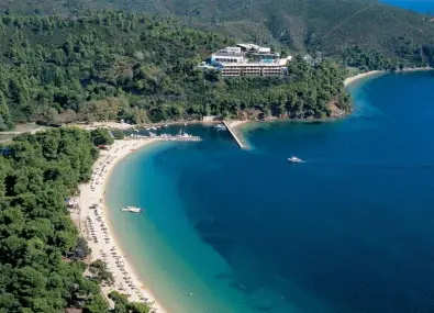 Ако желаете да избягате от ежедневието, хотел Skiathos Palace е най-добрият избор и точното място за почивка. Разположен на боров хълм, в югозападната част на Скиатос и предлагащ спираща дъха гледка към плажа Кукунарис, хотел Skiathos Palace съчетава удивителна природна красота заедно с креативен хотелиерски подход към клиента. Намира се само на 150 метра от пясъчния плаж Марата, и на 15 км. от летището на Ситатос. Известният плаж Кукунарис е на 250 метра от комплекса и предлага много възможности за водни спортове.