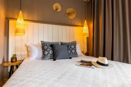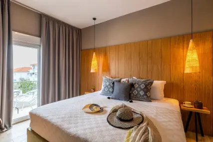 All rooms are fully renovated, bright and spacious. Also, the location is in a unique spot in the famous beach of Skiathos 'Îegali Ammos', only 50 meters! Skiathos Theros is located just 300 meters from the town of Skiathos and 1.5km from the airport. Make your reservation in Skiathos Theros in Skiathos Island and live unforgettable holidays!