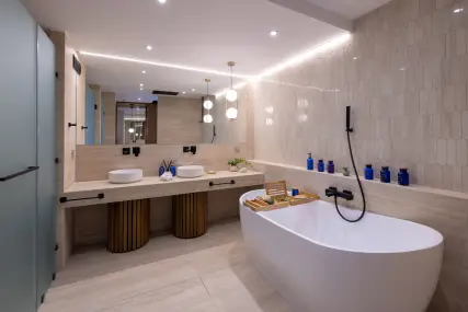 Зоната за хидротерапия разполага с три естествени басейна с гореща вода и зона за почивка с бар и великолепна гледка към Егейско море и Атон.