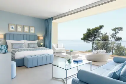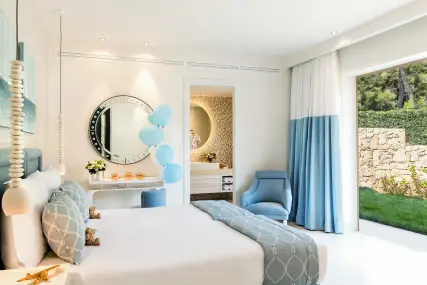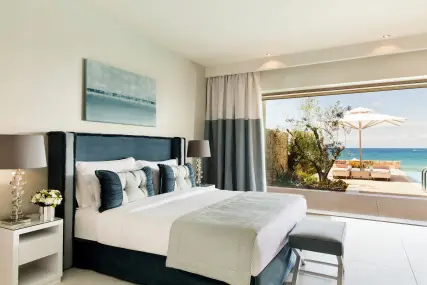 - Junior Suite SV Private Garden - стая с модерен дизайн, разположена в едноетажни сгради със самостоятелна градина. Прозорци от пода до тавана с невероятна гледка към Егейско море и върха на връх Олимп. Веранда с маса и два ратски стола и два шезлонга в градината. Двойно легло или 2 единични легла, разтегателен диван.