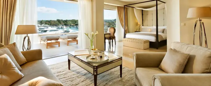- Suite with a view of the harbor or access to the beach - 60-65 кв.м. м, разположен на първи етаж от двуетажна сграда. Всекидневна, спалня. Веранда с градина (80 кв. м, с ратанови мебели, два шезлонга, диван и фотьойли).