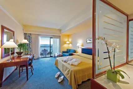 Хотелът предлага 241 просторни и елегантно обзаведени стаи, като повечето от тях са с невероятна гледка към плажа и Егейско море.