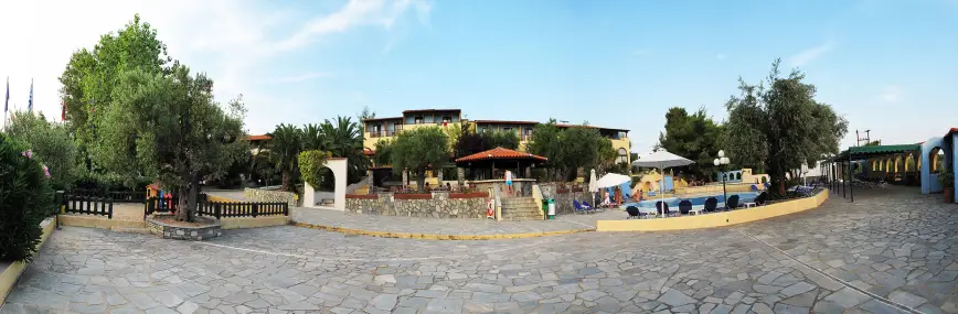 Хотелът е разположен на един от най-красивите плажове в Ситония, Халкидики - Еlea, който всяка година бива удостоен с Европейския син флаг за най-добър плаж. Разстоянието до плажа е около 50 метра. Хотелът е построен на площ от 18 600 кв.м. и се състой от 9 двуетажни сгради.