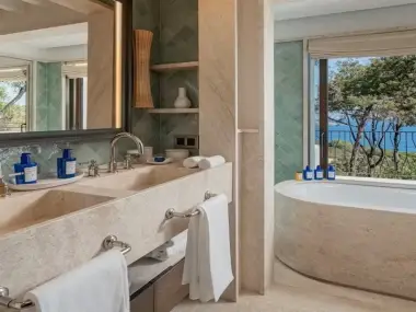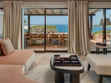 - Unique Suites With Private Pool (70 кв. м) - 9 уникални апартамента с изискан декор, спираща дъха гледка към морето, отделна луксозна всекидневна с дивани и фотьойли, отворена трапезария, спалня с двойно легло, баня с вана и душ, просторна тераса с частен отопляем басейн, частни трансфери с кола в рамките на курорта.