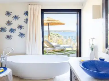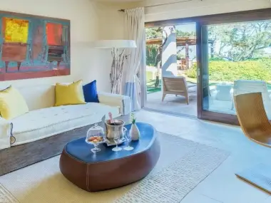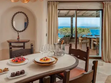 - Villa Corbezzolo 2 pax (67 кв.м) - луксозна вила с изискан декор и уединено местоположение, декорирана в пастелни цветове, гледка към морето, частен достъп до плажа, отделна всекидневна, спалня, баня, просторна тераса с трапезария и джакузи.