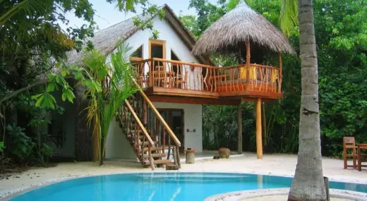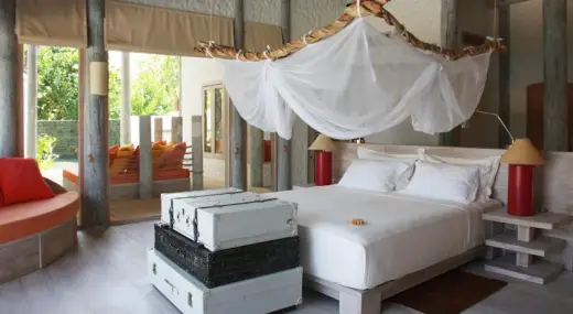 - 5 Two Bedroom Crusoe Suite with Pool (412 кв.м.) - Самостоятелни 2-етажни вили с басейн. На партерния етаж: спалня с двойно легло king size, 2 бани, съблекалня, хол, тераса с люлки и кът за сядане и кух двор с басейн, шезлонги и достъп до плажа. На втория етаж: спалня с двойно легло king size, тоалетна. Максимално настаняване - 6 възрастни или 4 възрастни и 2 деца. Вилата е на страната на изгрева.