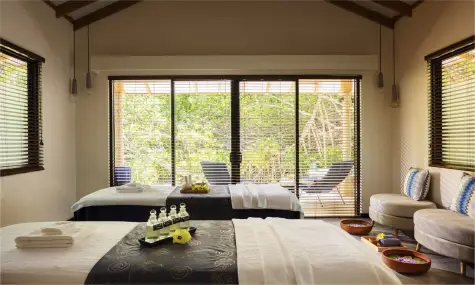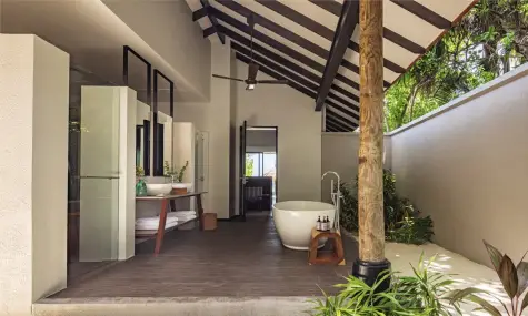 Стая: Двойно легло с кралски размери, диван, бюро, стол, гардероб, тераса с мебели, чадър, Wi-Fi, телевизия, IPTV, мултимедиен панел, климатик, таванен вентилатор, сейф, чай/кафе, бутилирана вода, мини-бар. Ютия и дъска за гладене са на разположение при поискване (ако има такива). Банята е частично на открито, в него: свободно стояща вана, тропически душ, две черупки, тоалетна, сешоар, тоалетни принадлежности, кърпи, чехли. Почистване на стаята и смяна на кърпи - ежедневно, смяна на спално бельо - на всеки три дни.
