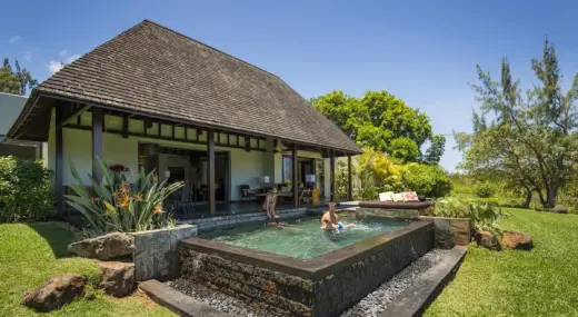 Заобиколен от буйни тропически градини и кристалните води на Индийския океан, Four Seasons Resort Mauritius включва 4 басейна. Комплексът предлага безплатно ползване на голф игрище, проектирано от Ърни Елс.