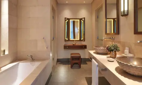 - Two Bedroom Deluxe Garden Pool Villa (~309 кв.м) – гледка към планината. Разполага с две спални (едната с двойно легло и две единични легла), хол с трапезария, два гардеробни, две бани с вана и душ тип „тропически дъжд“, паркинг, вътрешен двор с басейн с контролирана температура, трапезария и кът за сядане. Максимално настаняване: 4 възрастни + 2 деца