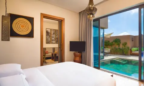 - One Bedroom Garden Pool Villa (~178 кв.м) – гледка към планината. Състои се от спалня с двойно легло king-size, хол, гардеробна, баня с вана и душ тип „тропически дъжд“, вътрешен двор с басейн с контролирана температура, кът за хранене и кът за сядане. Максимално настаняване: 2 възрастни + 2 деца