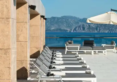 Стандартните стаи разполагат с изглед към морето или планината, климатик и отопление, шумозиолирани стени, прозорци и под, дървен под, сейф, почистване на стаите два пъти дневно, минибар, 24 часа, сервиране в стаите, баня с душ, огледало за гримиране, сешоар, хавлии и джапанки, кабелен и безжичен интернет, телефон с директно избиране, 42” плосък телевизор.