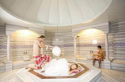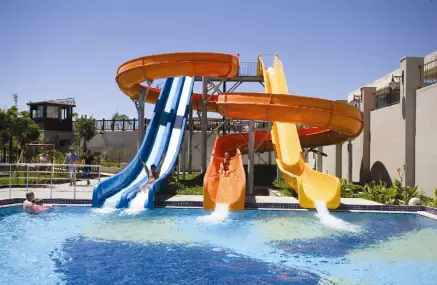 2 открити басейна, детски басейн, закрит басейн, водни пързалки, спа център, фризьорски салон, мини клуб,
